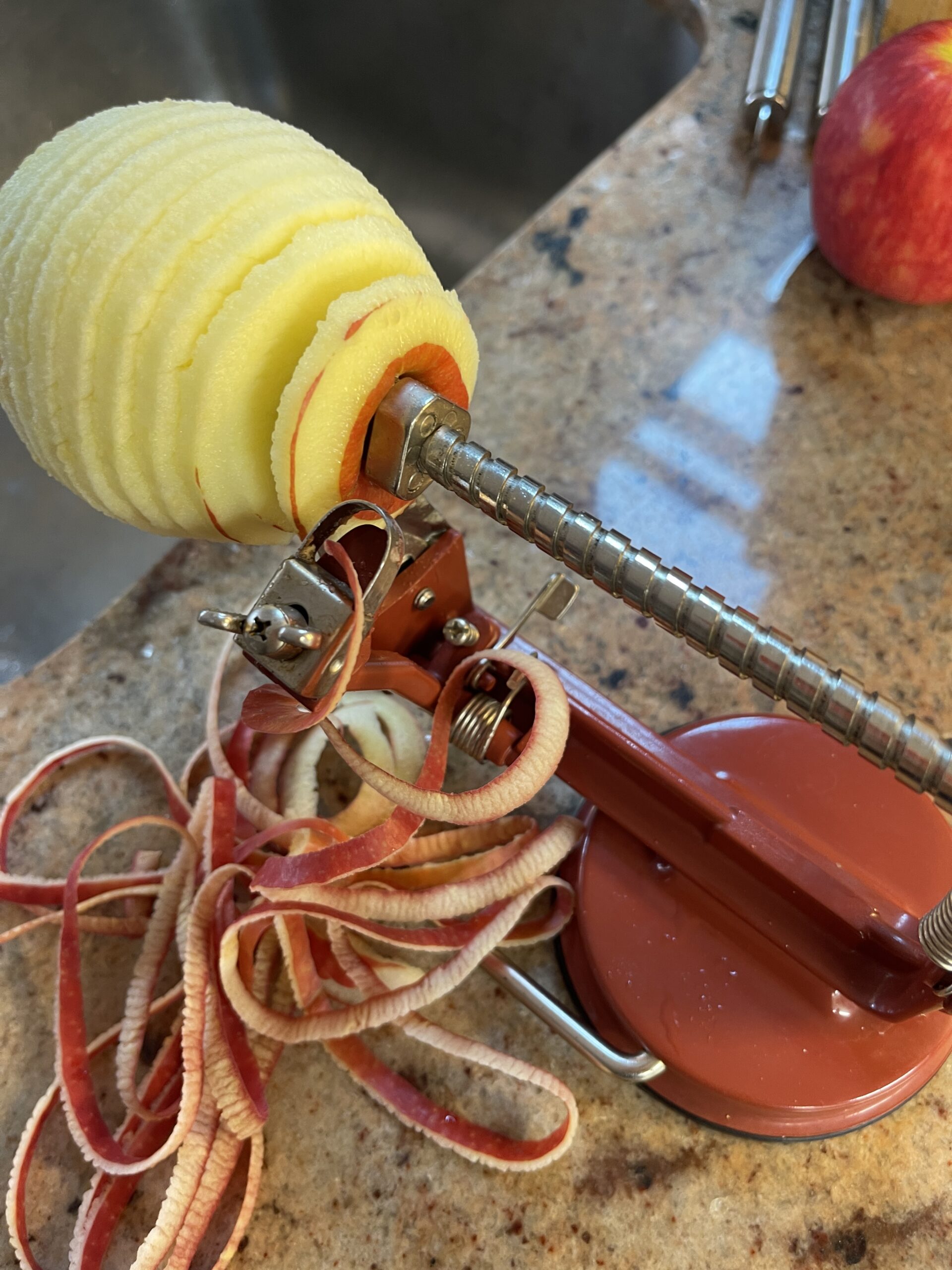 This cake is easy to make if you have one of those amazing apple peeler/corer/slicer thingies that I discovered long ago, brought to France when we moved here, and found no French friend who knew it existed! The best is the one with a suction clamp that will adhere to smooth surfaces like marble, granite or any smooth kitchen surface. And this amazing tool is such fun to use!