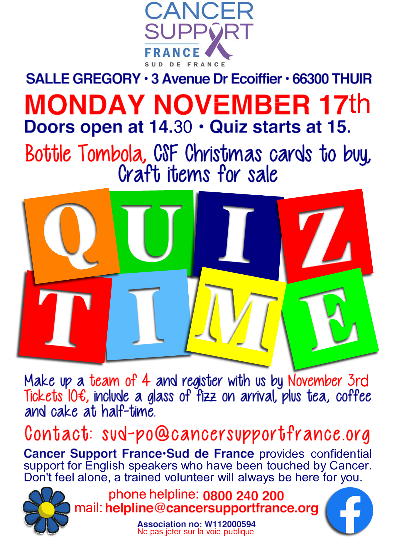The afternoon Quiz and tea party we have been planning (with cake, tea and Cava) will take place in Thuir in the Salle Léon J Gregory in the afternoon. The doors will open at 2.30, with the quiz starting at 3pm.
