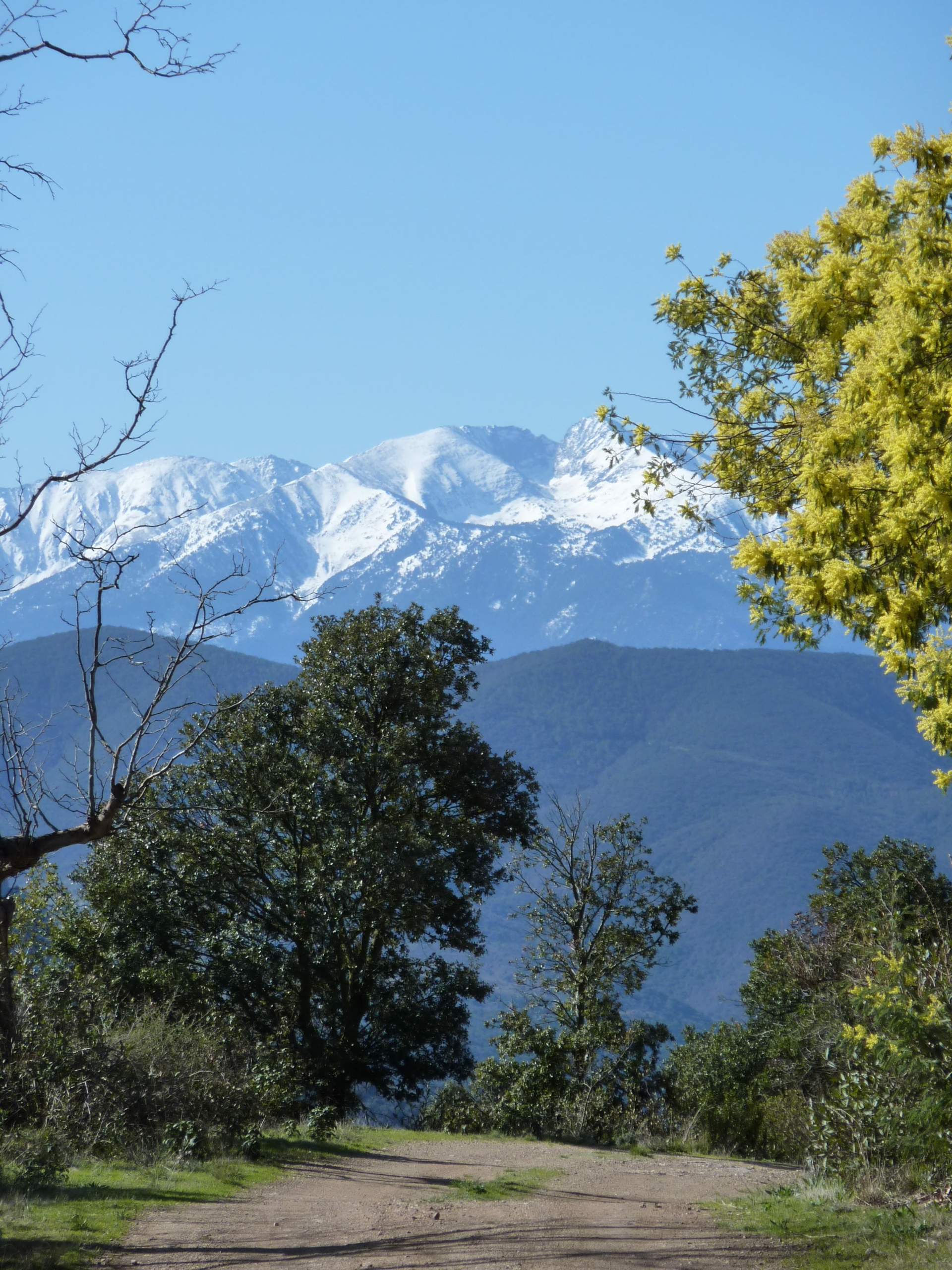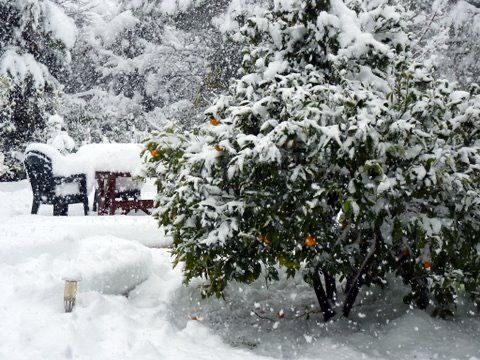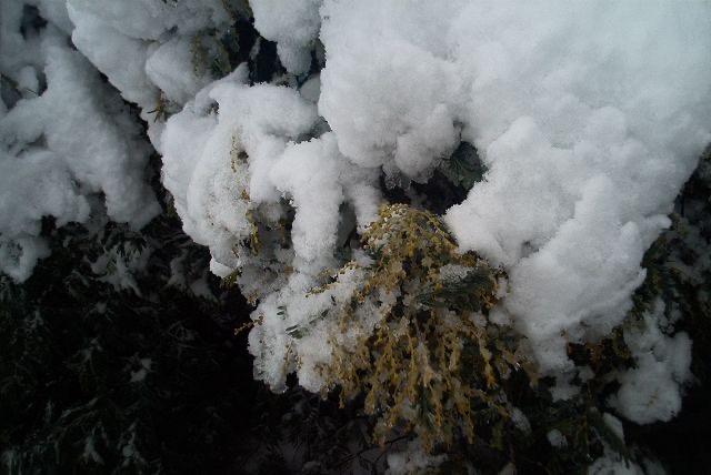The Canigou is hidden by thick white cloud and the Albères mountains are no longer visible through the white out. The mimosa, which was turning yellow and bringing a touch of Springtime to the P-O, has been taken totally by surprise, and peers with shock and disbelief from under its white wooly bonnet. Beautiful. Cold. I think it’s time for a cup of tea.
