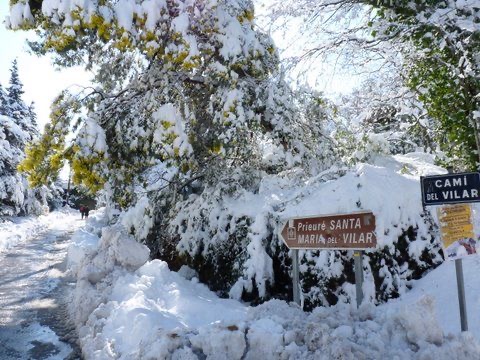 “Wow, this is absolutely fantastic! The whole world has gone white! I have never seen snow like this in England – it just keeps on coming down. In fact, the last time I saw snow falling as relentlessly as this was in Quebec on a school ski trip many years ago. Over there, life continued as if nothing was happening: snow ploughs quickly cleared the main roads, creating two to three metre walls of snow on the pavements so that it was like walking through a snow tunnel – but traffic continued as normal and people went about their daily life. Here, life seemed to have come to a total halt. There is no traffic on the roads (which have NOT been cleared at all in Maureillas) and the postman didn’t even attempt to come along our road this morning. In fact, there is nobody around at all. Soooooo quiet. Branches are snapping off trees with the weight of the snow and the telephone and electricity lines are loaded and straining worryingly under the burden. It’s beautiful and very eerily exciting but I might well change my mind if our electricity fails and we have no heating or cooking facilities!”
